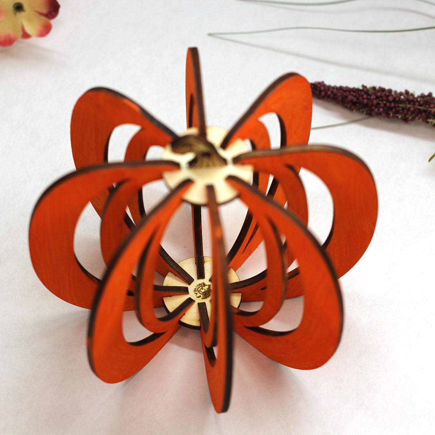 Very unique 3D Pumpkin is perfect and elegant for any room or office. Light weight and very vibrant the 3D Pumpkin adds a modern yet classic accent to any space. Can by placed on or hung from anywhere from a desktop to a forever tree.